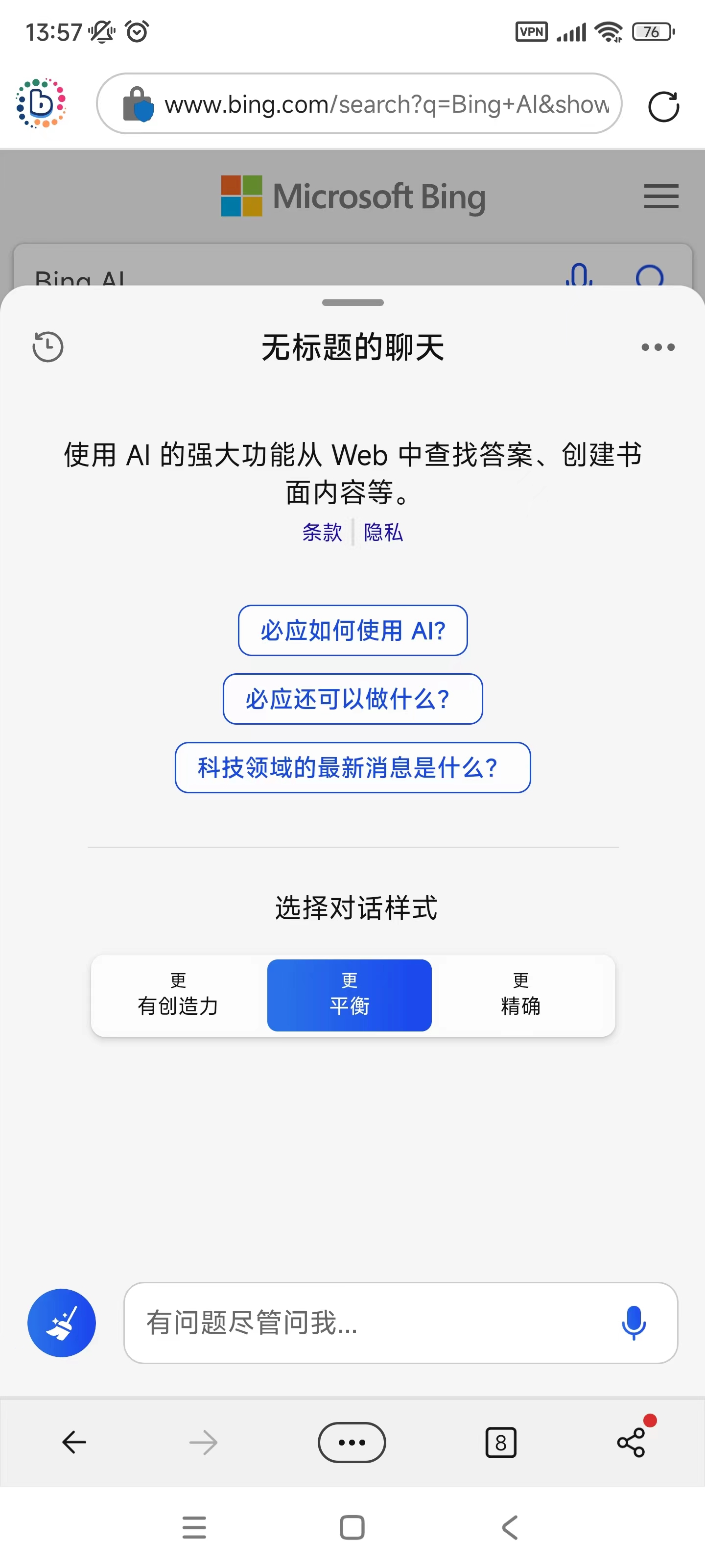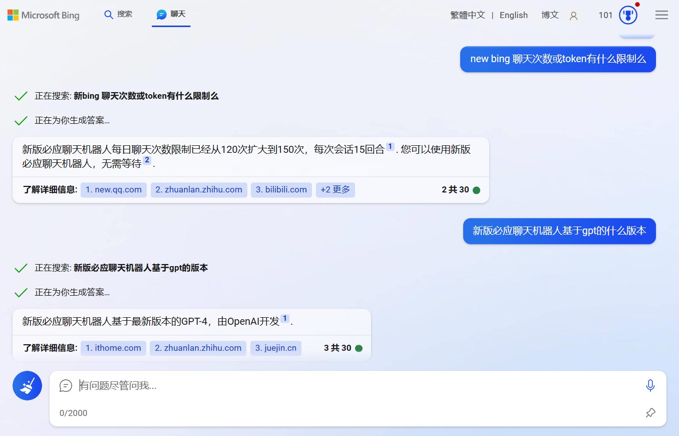 • 新版必应聊天机器人每日聊天次数限制已经从120次扩大到150次,每次会话15回合1. 您可以使用新版必应聊天机器人,无需等待 你可以问他关于他你想知道的问题